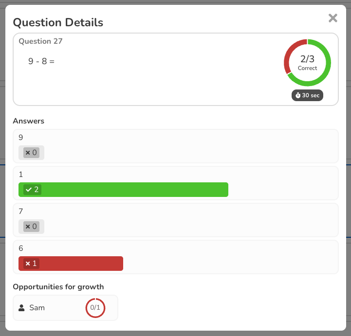 You can sort the student’s results to review correct and incorrect responses, and even see how they performed on repeated attempts of the same question if you click into one of the questions.