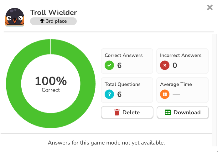 Below the summary, you’ll find a Leaderboard showing every student who participated in the game. This includes: