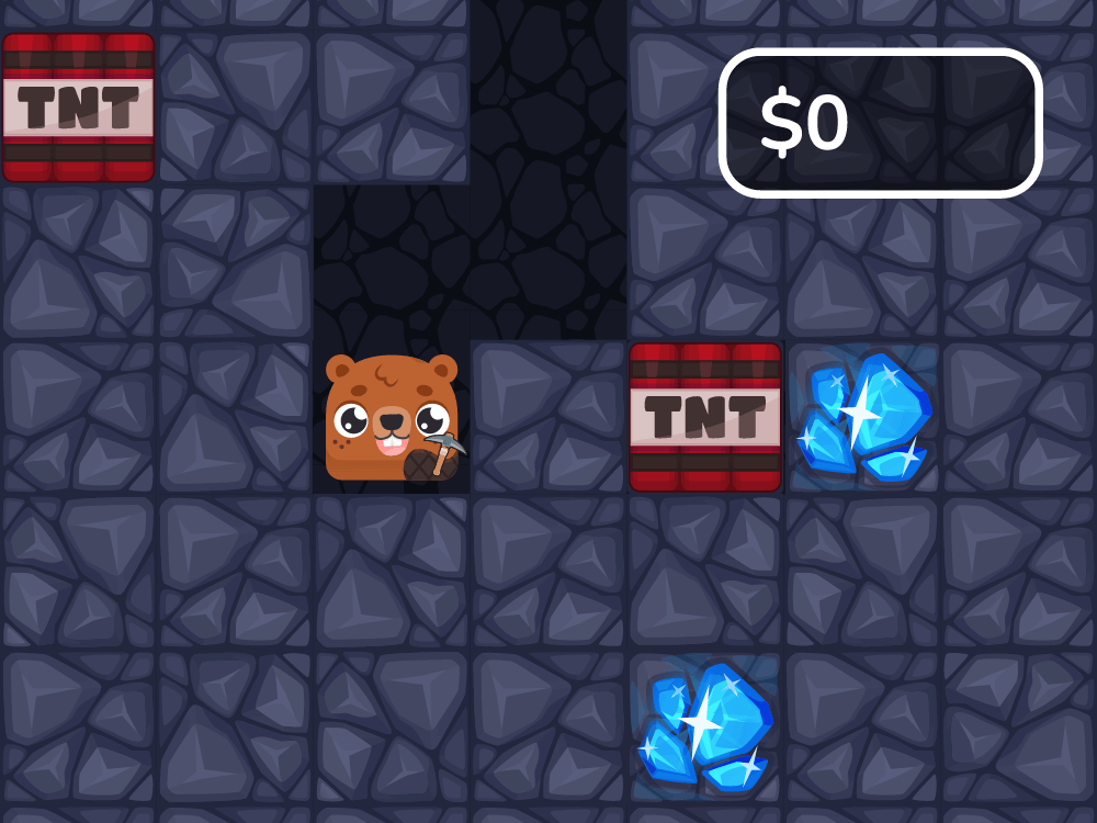 - TNT clears surrounding blocks instantly, collecting all ore in the blast area.