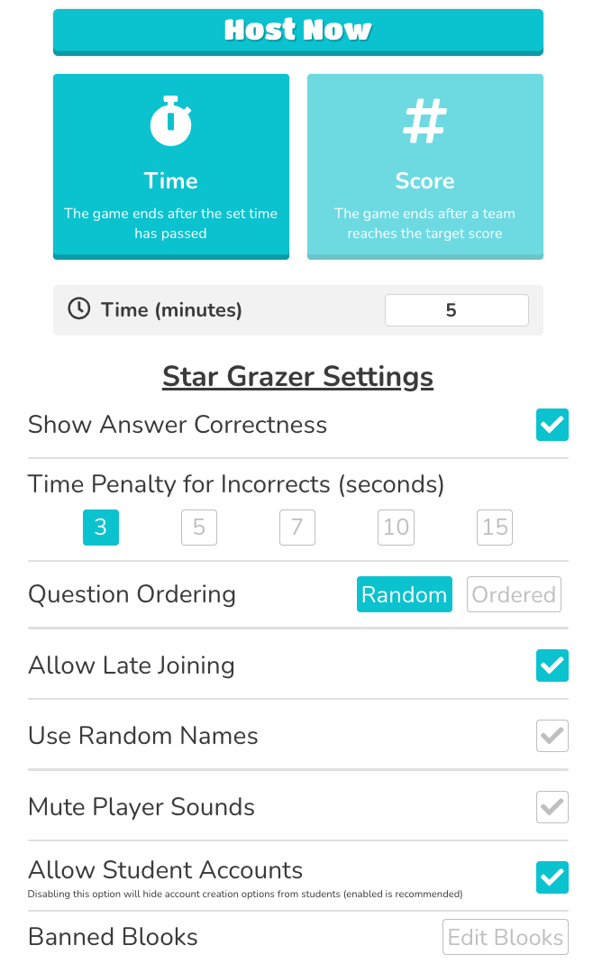 To host Star Grazer, select a Question Set, click Host, and choose Star Grazer (Plus Only). Adjust the host settings, share the game code, QR Code, or link with students, and then click Host Now to begin.