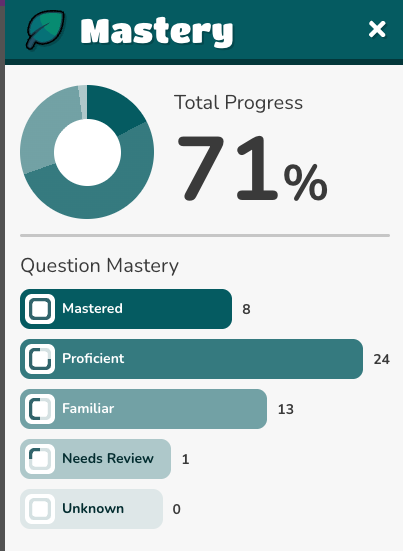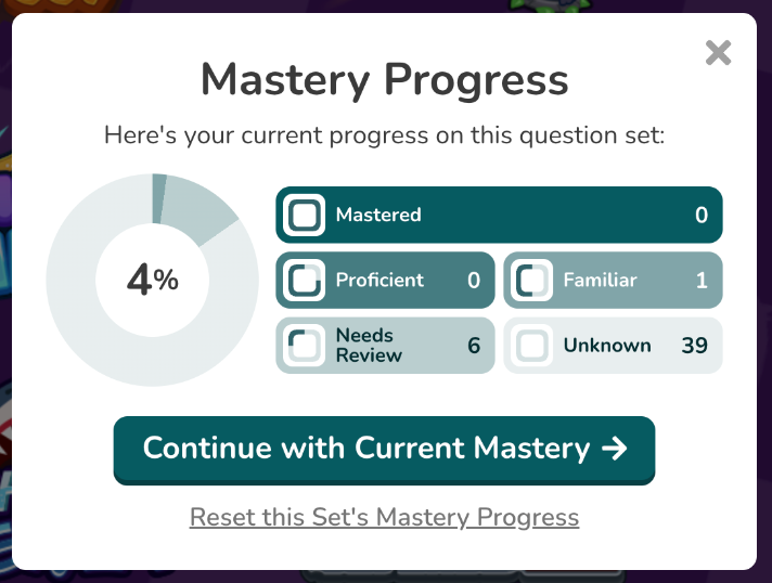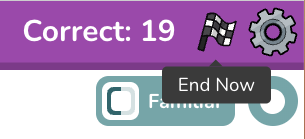 Note: Mastery progress is only saved when you select the "end game" option (checkered flag) while playing Curriculum sets in Solo mode, not Homework.