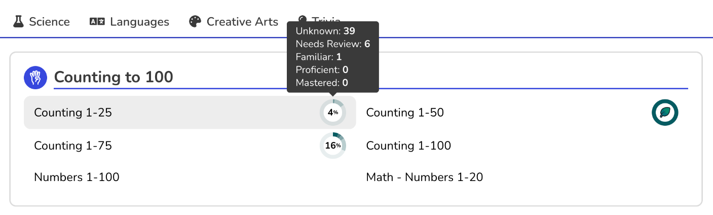 Each set shows a percentage, so you always know how close you are to full mastery.